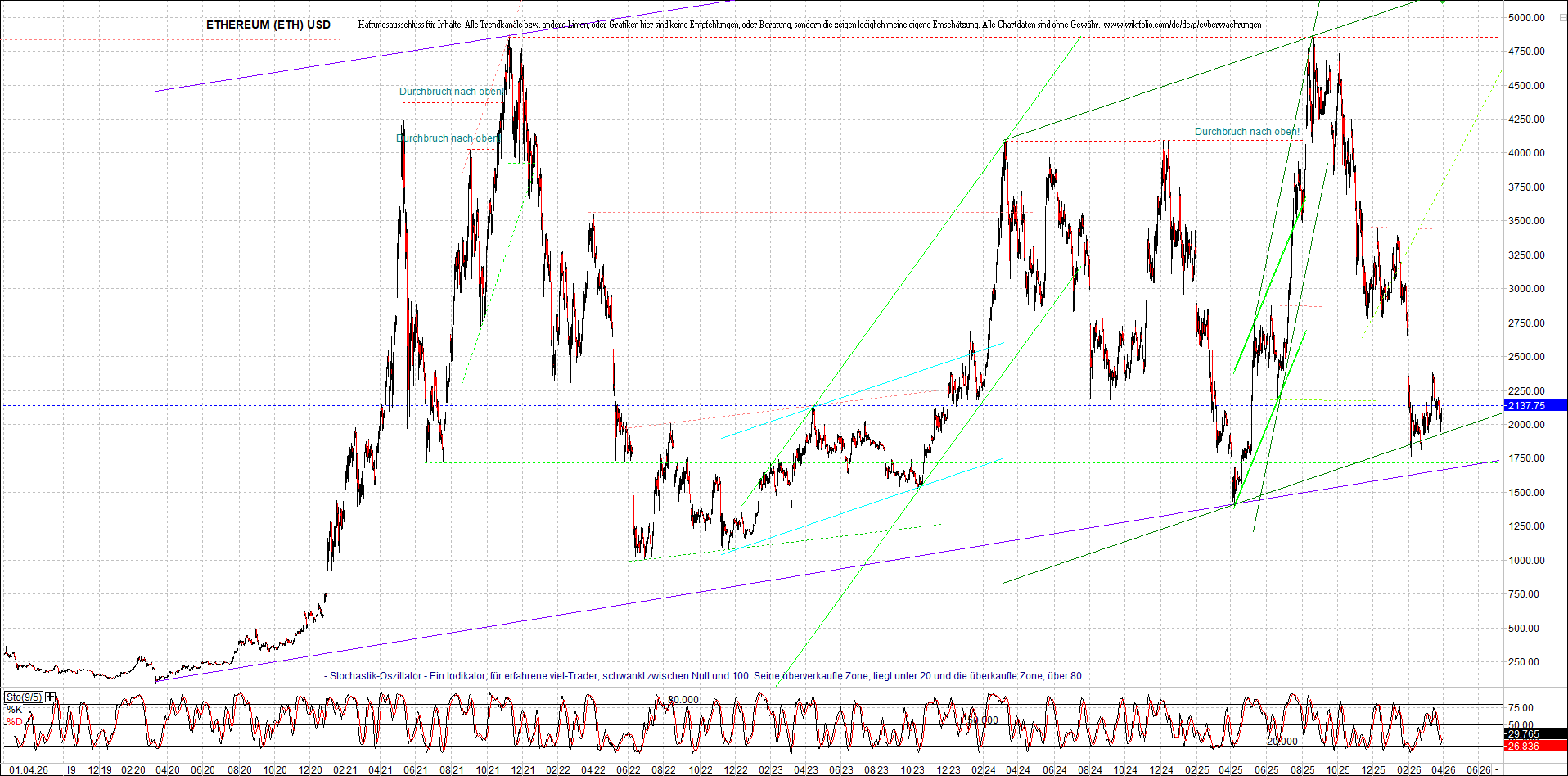 ETHEREUM (ETH) – 5 Jahre Chart, von heute Morgen, mit Charttechnik.