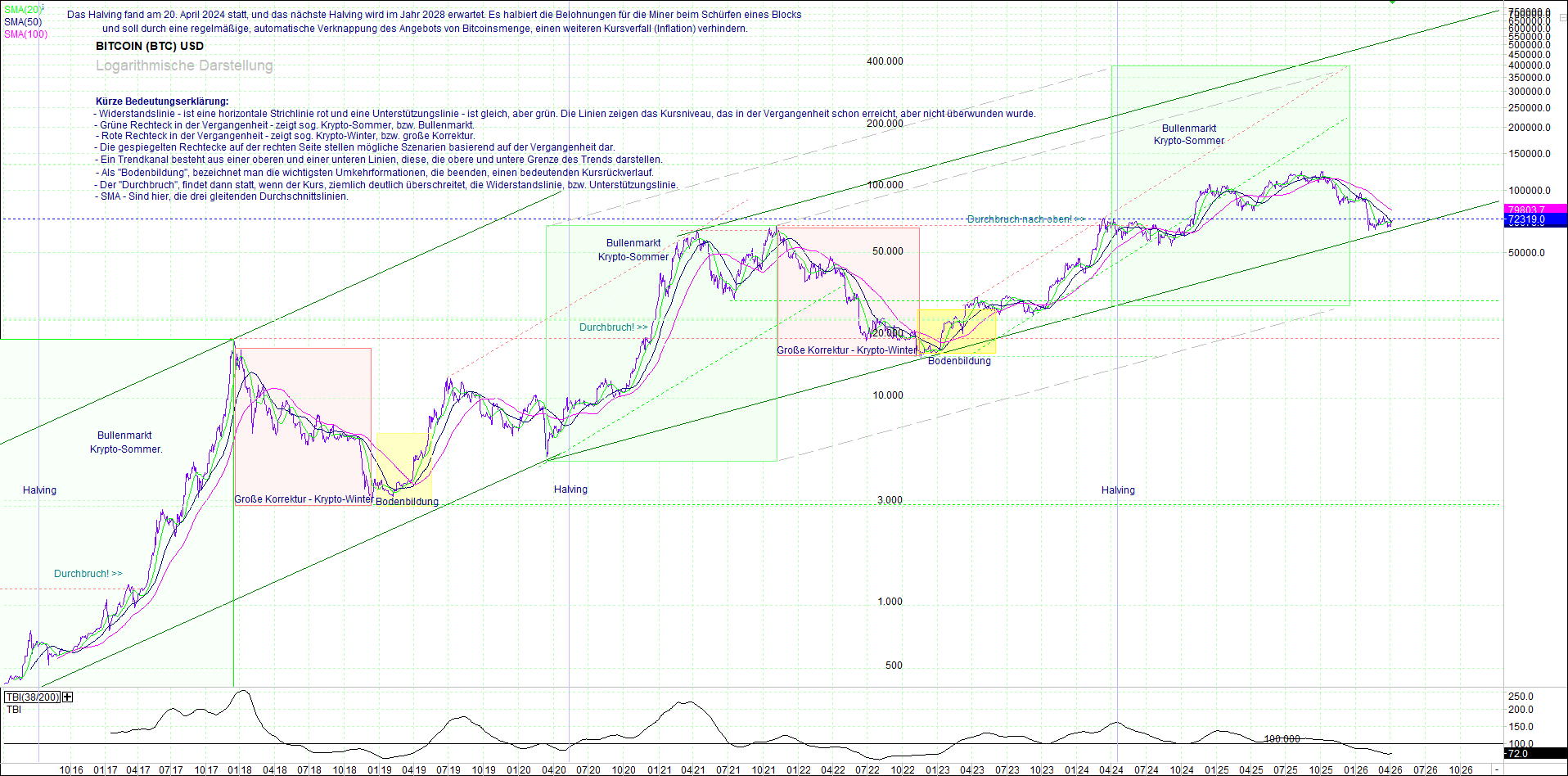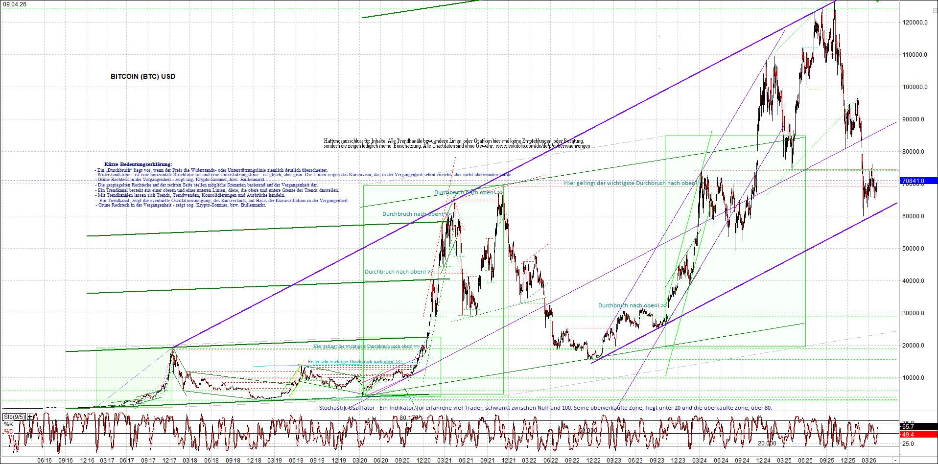 BITCOIN (BTC) – 10 Jahre Chart, von heute Morgen, mit Charttechnik.