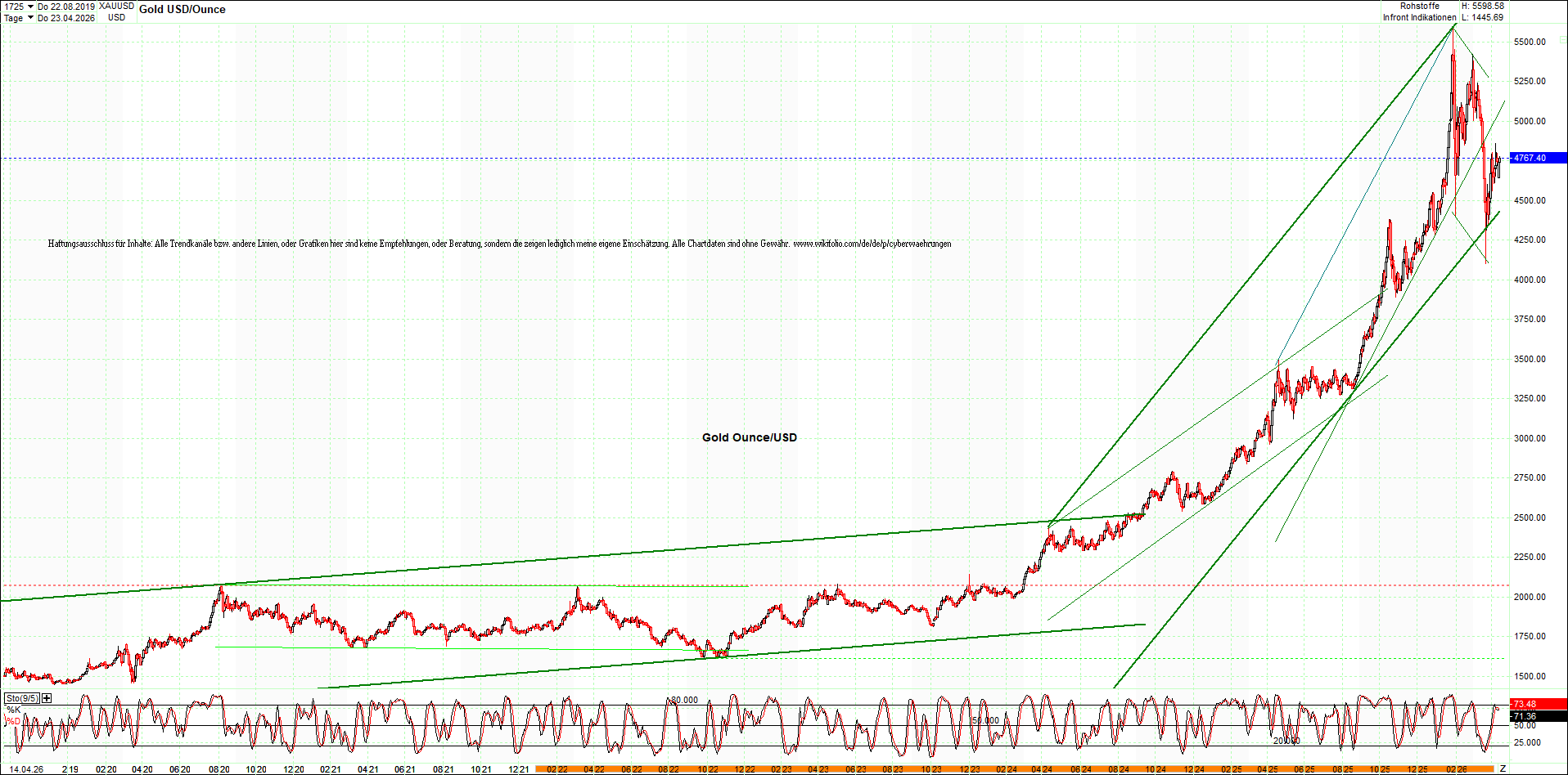 GOLD – 10 Jahre Chart von heute Morgen, mit Charttechnik.