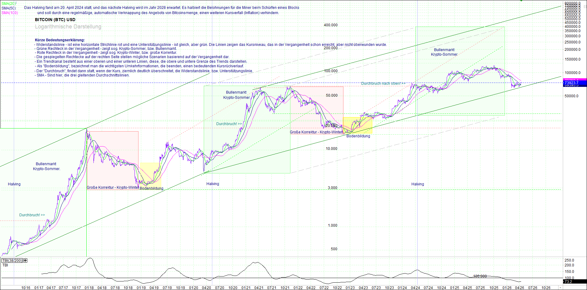 BITCOIN (BTC) – 10 Jahre Chart, von heute Morgen, mit Charttechnik.