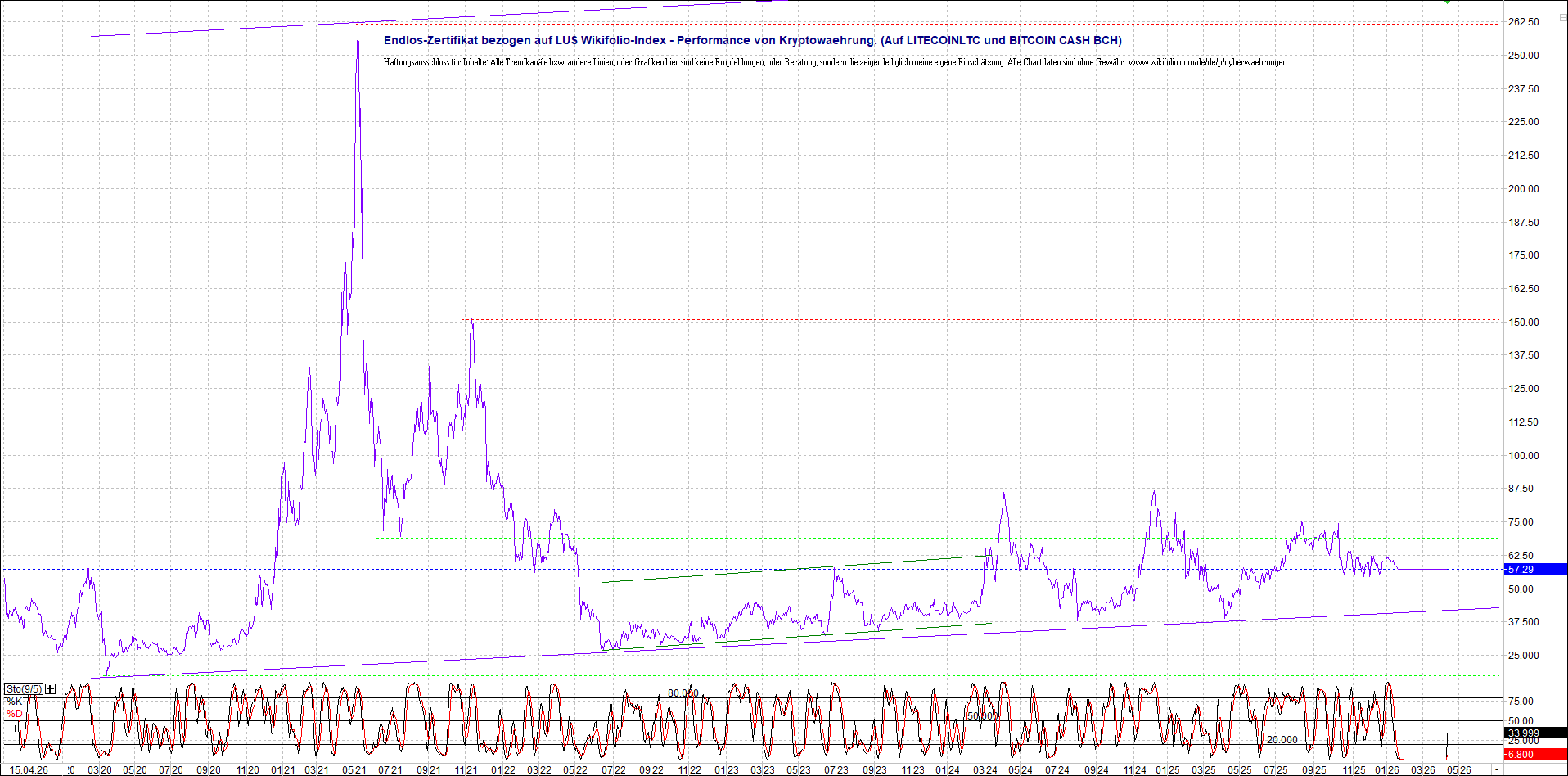 Anbei das Zertifikat, bekannt als: Endlos-Zertifikat bezogen auf LUS Wikifolio-Index „Performance von Kryptowaehrung“, jetzt versorgt mit Performance von Litecoin (LTC) und mit Bitcoin Cash (BCH).