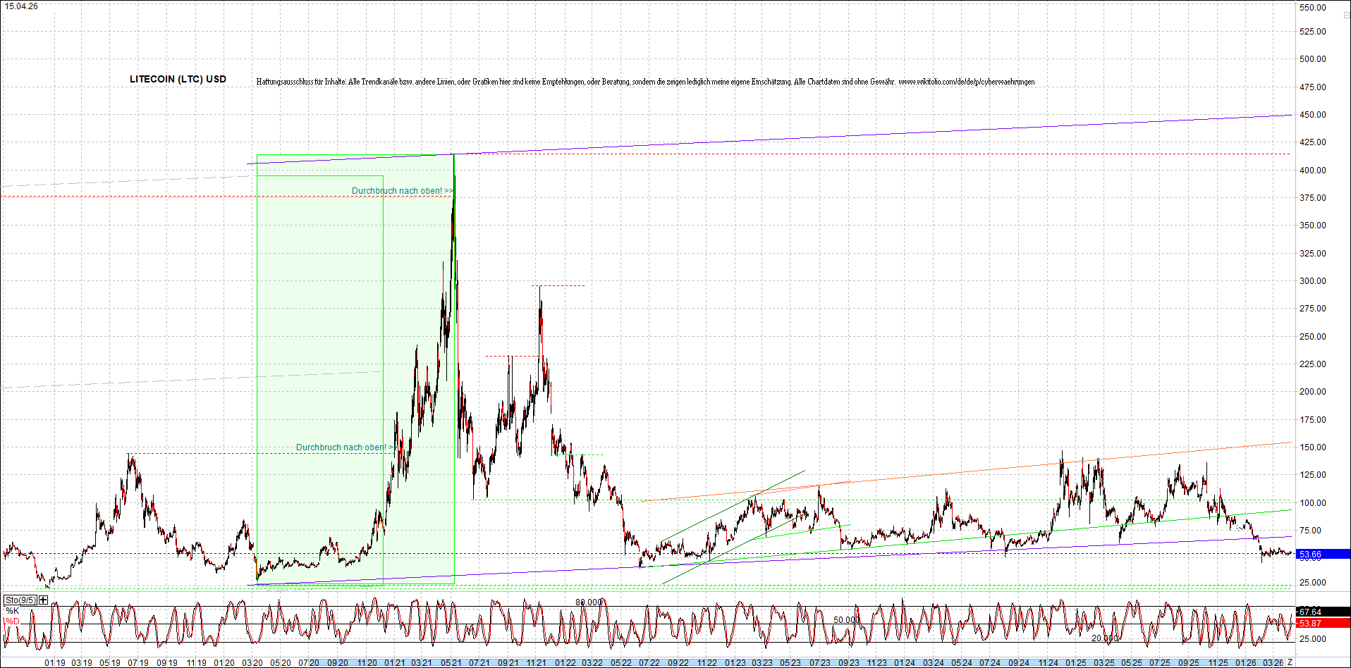 LITECOIN (LTC) – 6 Jahre Chart, von heute Morgen, mit Charttechnik.