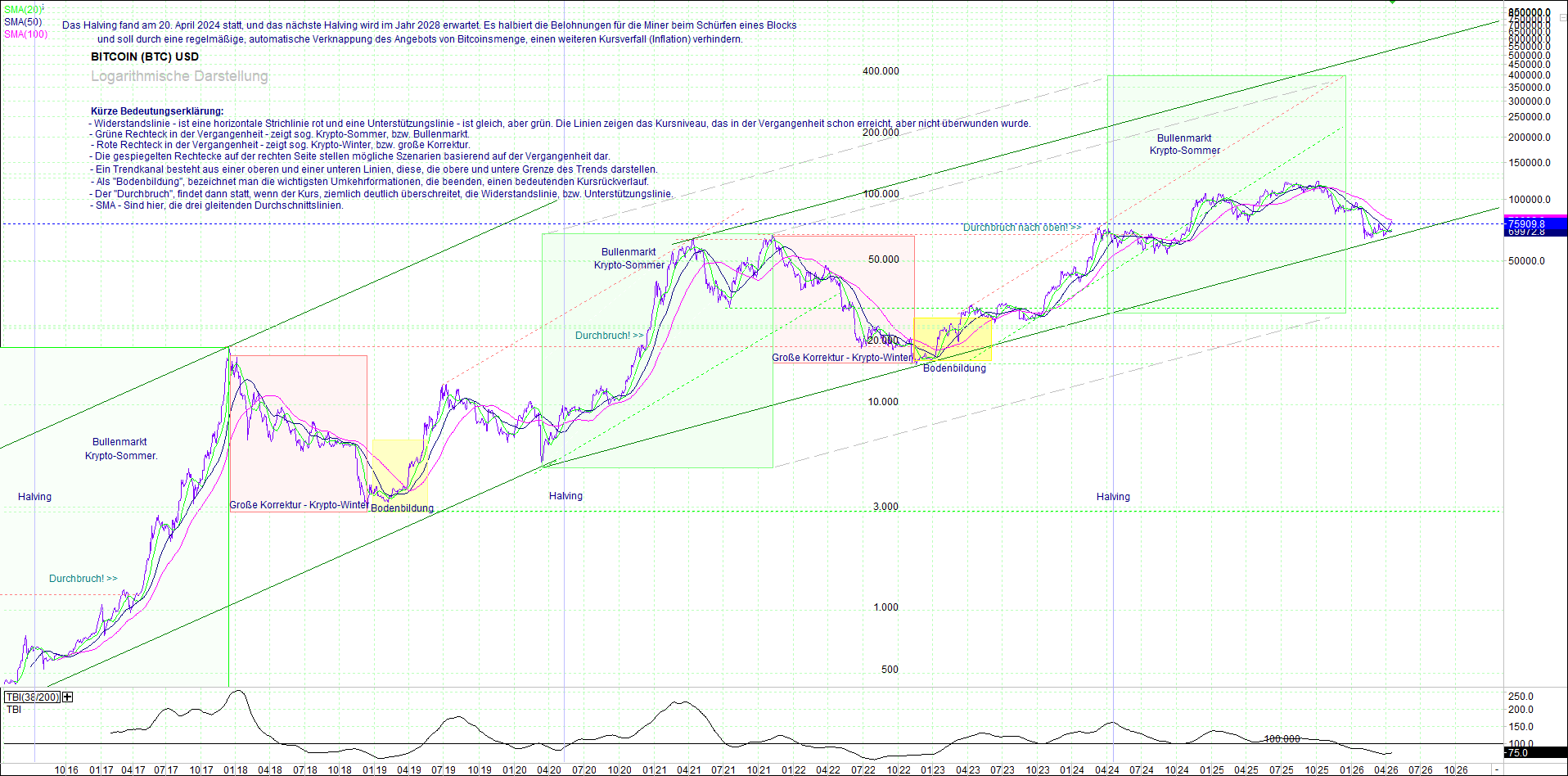 BITCOIN (BTC) – 10 Jahre Chart, von heute Morgen, mit Charttechnik.